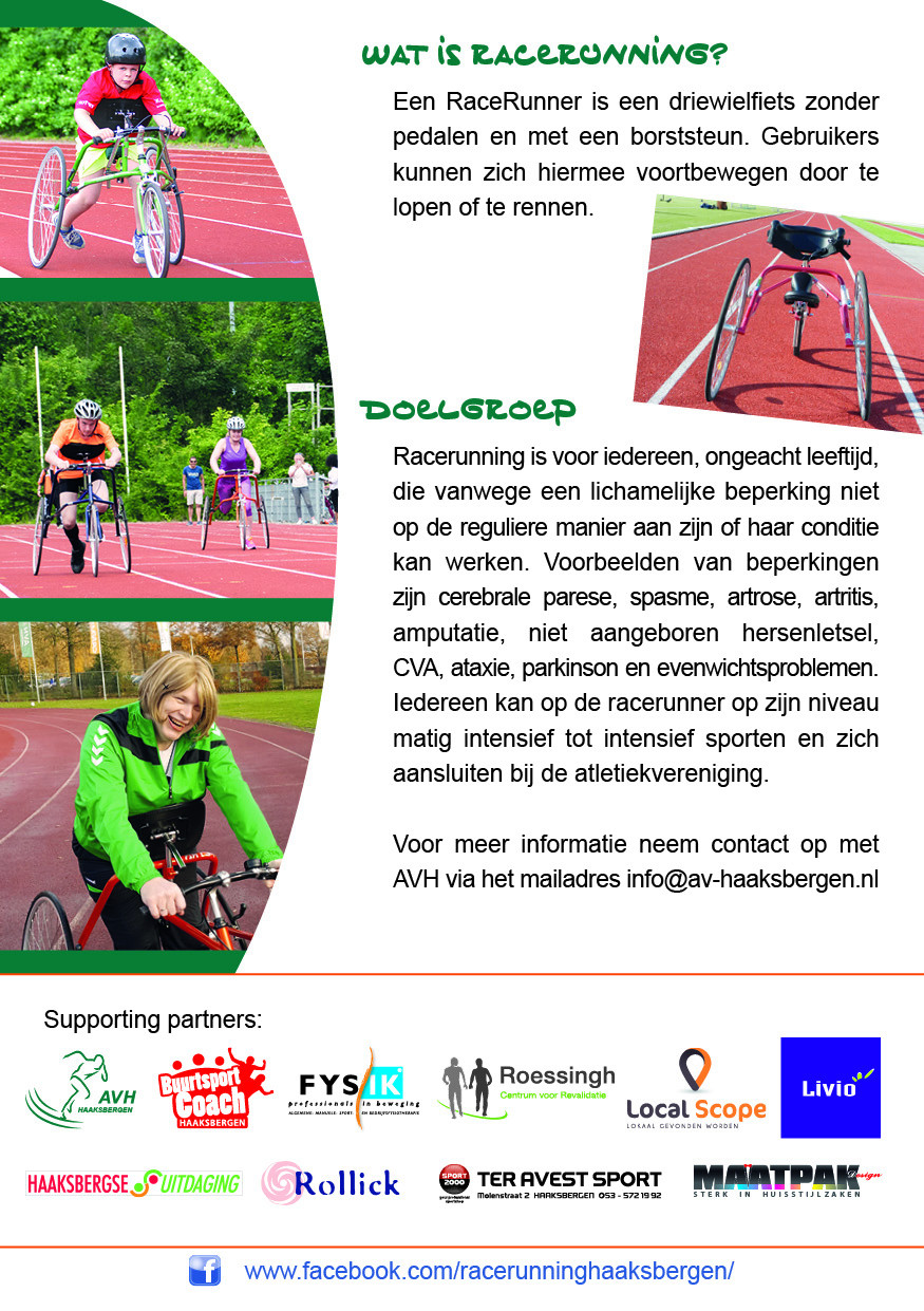 Racerunning biedt mensen die moeite hebben om zelfstandig te lopen de mogelijkheid om toch in de buitenlucht te kunnen sporten met een soort loopfiets.